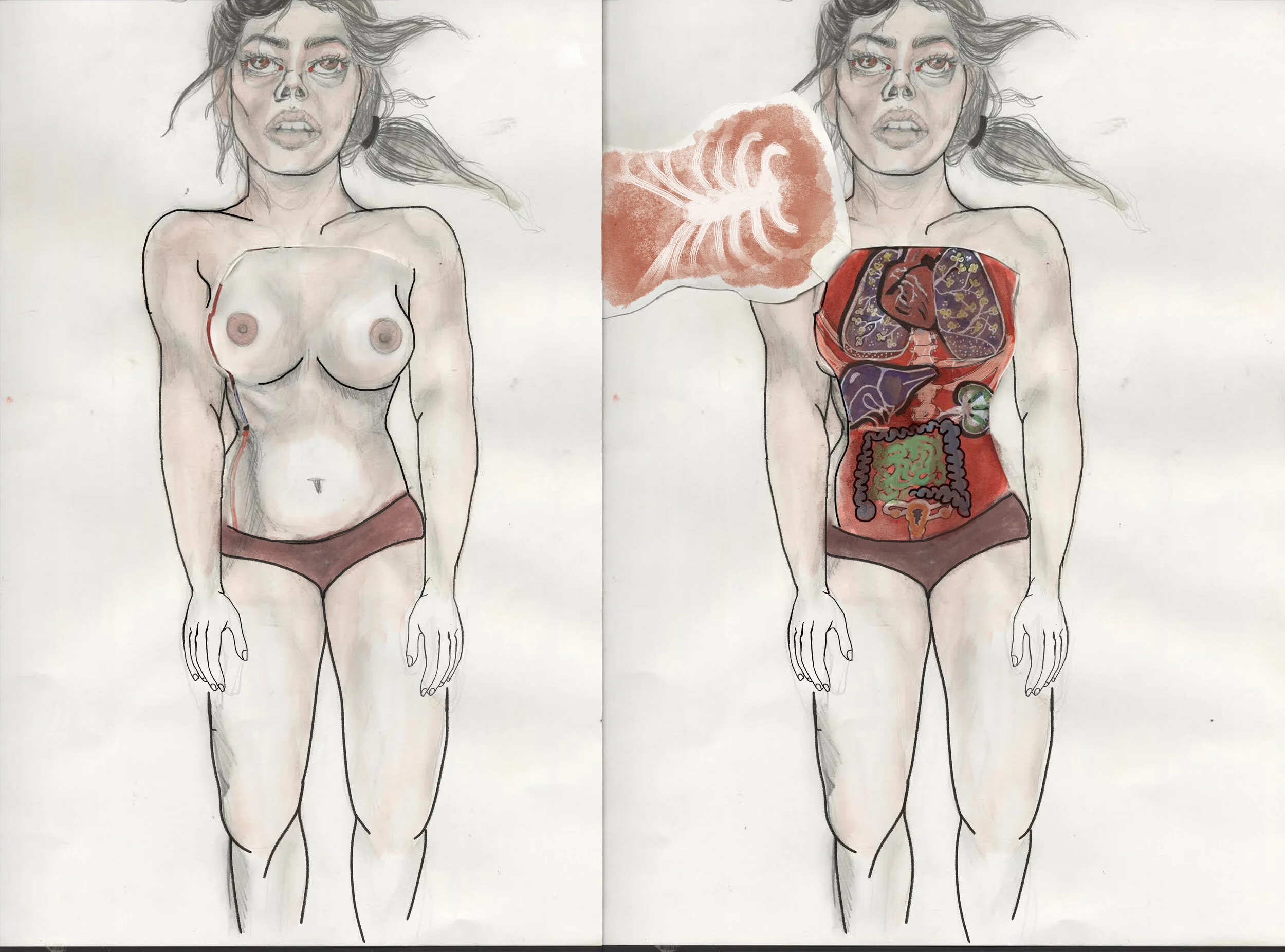 My take: I created this interactive piece so students can open her up and remove some of the organs. The uncanny feeling of opening someone’s rib cage to steal their body parts helps students visualize this dystopian utilitarian society.
