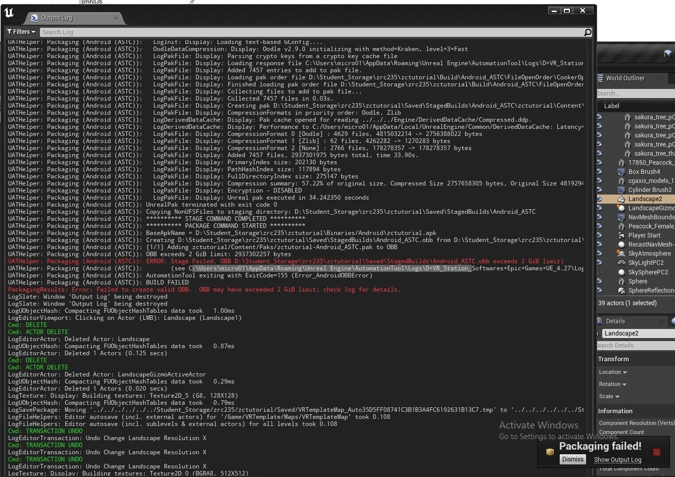 Deleted the water, stopped crashing. Tried to package, got “OBB too big” error message.