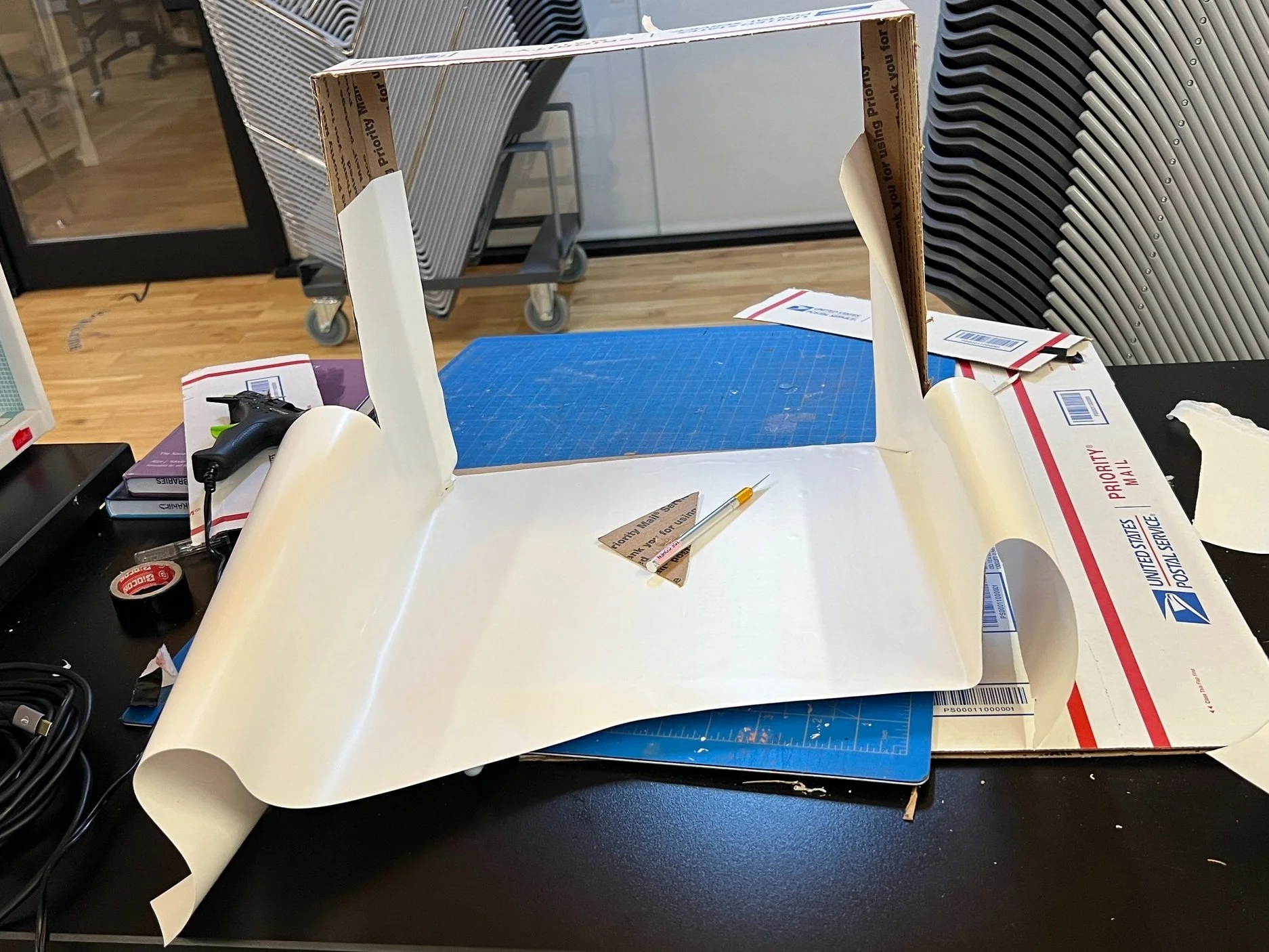 Created the bedroom base with cardboard boxes, folding and gluing. I was originally going to make another iteration of this project, but the next iteration went in a different direction so I didn’t make a cleaner, more precisely cut version of this.