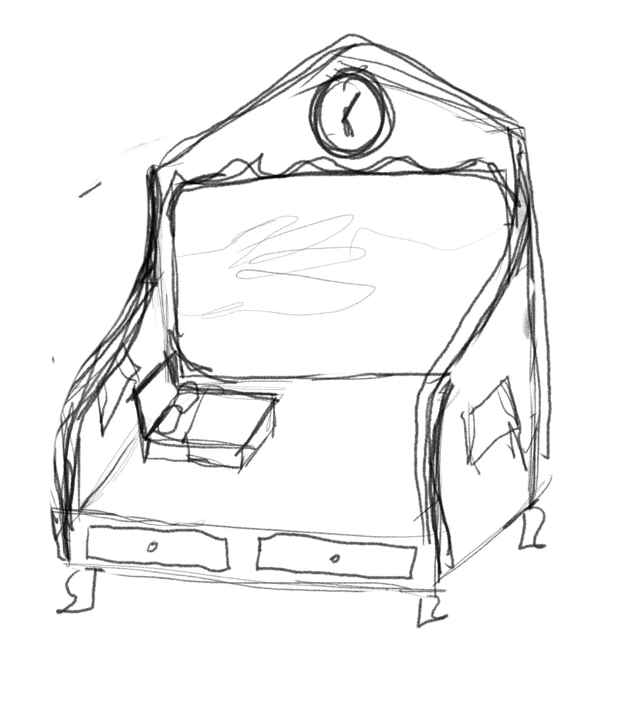 Attached a clear, frosted sheet of acrylic, and back projected for the wall of the bedroom. The wall video was images of my bedroom from the past 10 years with drawings of “stuff on my floor” falling in front. Originally planned on having actual tiny objects on the floor but decided it wouldn’t work for projection mapping.